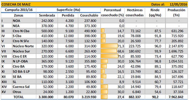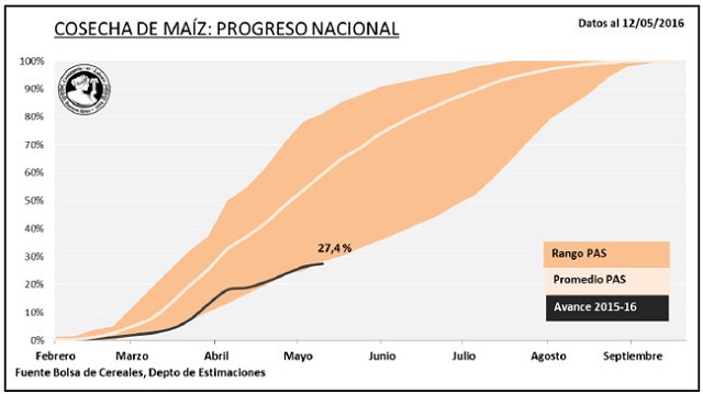Durante la última semana, la recolección de lotes de maíz con destino grano comercial continuó de manera pausada por la falta de piso en gran cantidad de lotes. La cosecha avanzó sobre lotes tempranos en el centro del área agrícola nacional, con rendimientos dispares producto del temporal de abril.