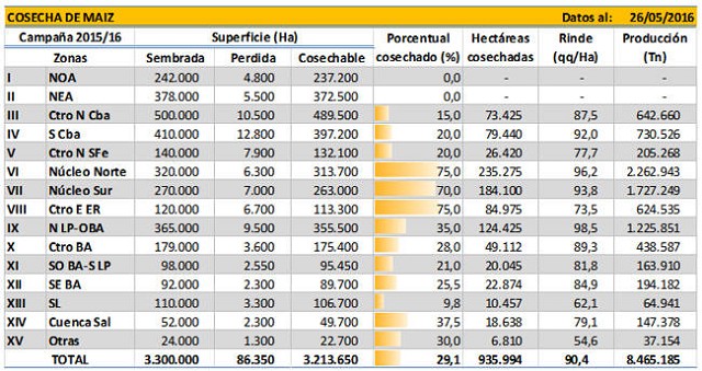En paralelo, sobre el Sudeste y Sudoeste de Bs. As.-Sur de La Pampa los cuadros tardíos y de segunda ocupación transitan madurez fisiológica (R6). Las últimas heladas, no habrían afectado la fase final del llenado de granos. Hacia las zonas Norte de La Pampa-Oeste de Bs. As., Centro de Bs. As. y la Cuenca del Salado, la cosecha de cuadros tempranos sigue brindando rendimientos que superan los 100 qq/Ha; mientras que en paralelo las expectativas sobre los lotes tardíos se mantienen elevadas.