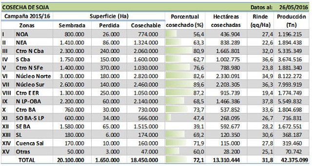 Luego de avanzar 11 puntos porcentuales durante los últimos siete días, la recolección de soja logró cubrir el 72,1 % de la superficie apta y el retraso interanual se redujo a -18,2 puntos. El rinde promedio nacional cayó 1 qq/Ha desde nuestra anterior publicación y se estima que finalice próximo a los 30 qq/Ha al cierre del ciclo. La superficie cosechada ya supera las 13,3 MHa y el volumen parcial acumulado se ubica por encima de las 42,3 MTn. Las pérdidas de área ascienden a 1,65 MHa, pese a ello la proyección de producción se mantiene en 56.000.000 de toneladas en gran medida gracias a los rendimientos récord registrados en diferentes regiones de las provincias de Buenos Aires y La Pampa.