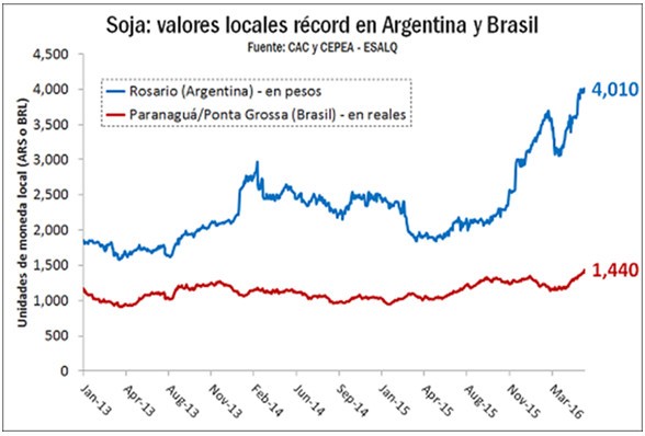 El gráfico provisto por la BCR, según las fuentes de CAC y CEPEA – ESALQ es muy interesante.