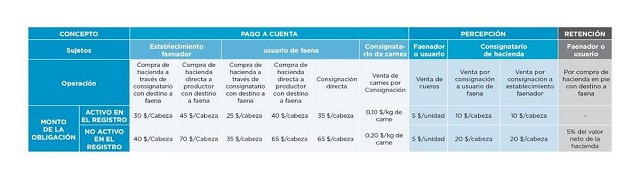 El monto del pago a cuenta deberá calcularse multiplicando el número de animales propios faenados en cada jornada —aunque no se produzca la venta posterior de la carne por cualquier causa—, por el importe que surge de la tabla contenida en el Anexo.