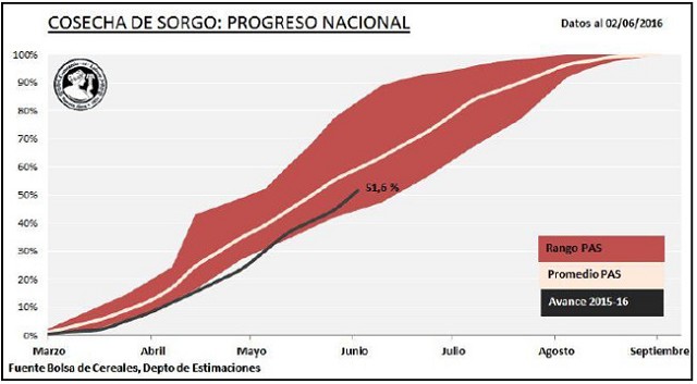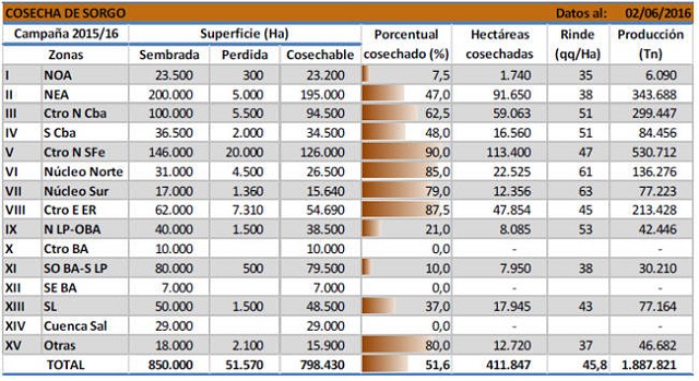 La producción de sorgo granífero con destino grano comercial para la campaña 2015/16 se estima en 3,5 millones de toneladas, volumen similar al producido durante la campaña pasada. El área sembrada es de 0,85 millones de hectáreas, también semejante a la siembra realizada durante el ciclo previo. El avance de cosecha es de 51,6 % de la superficie apta y acumula un retraso interanual del -6,9 %. El rendimiento promedio nacional se redujo -0,8 quintales en comparación al informe previo, y a la fecha se calcula en 45,8 qq/Ha. La reducción en los rendimientos se relaciona directamente con la entrada a cosecha de lotes que han pasado etapas reproductivas y de maduración con presencia de excesos hídricos. En cuanto al volumen parcial acumulado en chacra, el mismo es de 1,9 MTn.
