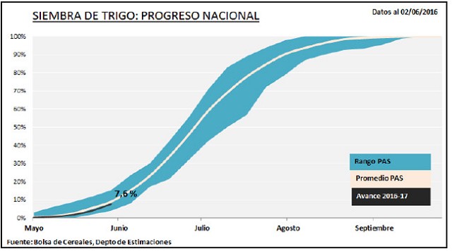Continúa la siembra de trigo sobre el centro-norte del área agrícola nacional, registrándose las primeras incorporaciones de lotes tempranos en las regiones Núcleo Sur, Centro de Buenos Aires, San Luis y la Cuenca del Salado. A su vez, la implantación del cereal cobró mayor fluidez en las localidades del Centro-Norte de Córdoba y Santa Fe que estuvieron afectadas por los excesos hídricos, como consecuencia de un mayor avance de las cosechadoras sobre los lotes de soja que serían destinados al cultivo de trigo. A la fecha, el progreso nacional de siembra alcanzó el 7,6 % de las 4.500.000 de hectáreas previstas para la campaña en curso. El avance intersemanal fue de 3,7 puntos, elevando el área implantada a 340.000 hectáreas, permitiendo calcular un retraso en comparación al ciclo previo de - 2,2 puntos porcentuales.