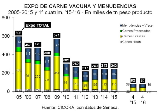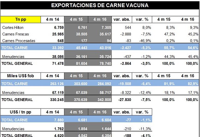 El volumen de exportaciones de carne vacuna certificado por el Senasa ascendió a 13.967 toneladas peso producto (tn pp) en abril del corriente año. En términos mensuales se registró una suba de 33,3%, en tanto que en relación a un año atrás resultaron 19,1% mayores. Y la recuperación de abril también impactó en el primer cuatrimestre de 2016, período en el que las exportaciones de carne vacuna totalizaron 43.016 tn pp y recortaron la caída acumulada de 19,2% anual en el primer trimestre del año a 5,3% anual en enero-abril. Medidas en toneladas res con hueso (tn r/c/h), en abril las exportaciones equivalieron a 20,14 mil tn, y las del primer cuatrimestre llegaron a 62,2 mil tn.