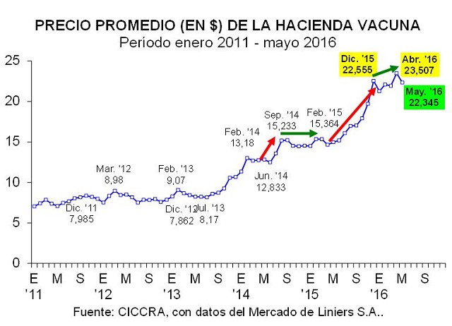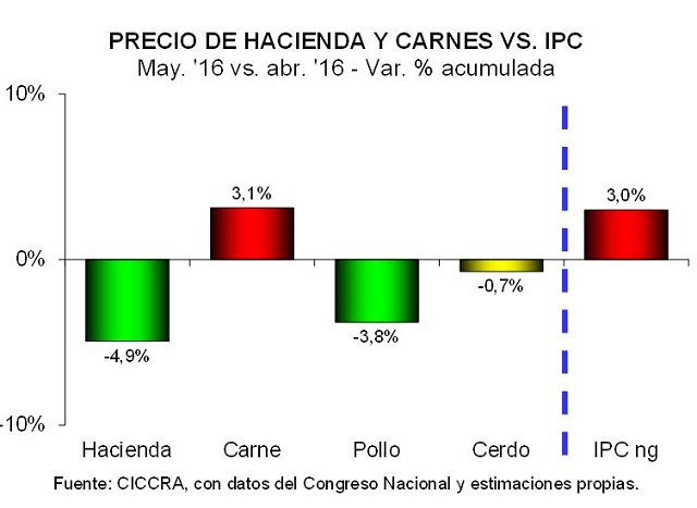 En mayo la corrección parcial del precio de la hacienda en pie (-4,9%) se contrapuso con una suba de 3,1% del precio promedio de la carne vacuna en el mostrador. Y al medir la variación entre puntas del año (mayo 2016 vs. diciembre 2015) en el Área Metropolitana de Buenos Aires (AMBA: Ciudad de Buenos Aires y Gran Buenos Aires) el valor promedio de la carne vacuna registró un aumento de 3,1%, cuando la hacienda en pie registró una caída de 0,9%. Esto no llama la atención, porque se trata de un período de tiempo muy breve y los ajustes de precios en el mostrador tienen rezago con respecto a la evolución del precio de la hacienda en pie. Y ello queda de manifiesto cuando se tiene en cuenta un período de análisis más extenso. Al comparar los primeros cinco meses de 2015 y 2016 surge que el valor de la hacienda en pie subió 48,5% y el de la carne en el mostrador 46,6%. A su vez, si se contrasta con agosto de 2009, cuando quedaron a la vista los resultados de la política antiganadera del gobierno nacional anterior, el valor de la hacienda acumuló un alza de casi 700% y el precio de la carne al consumidor final otra de 657%.