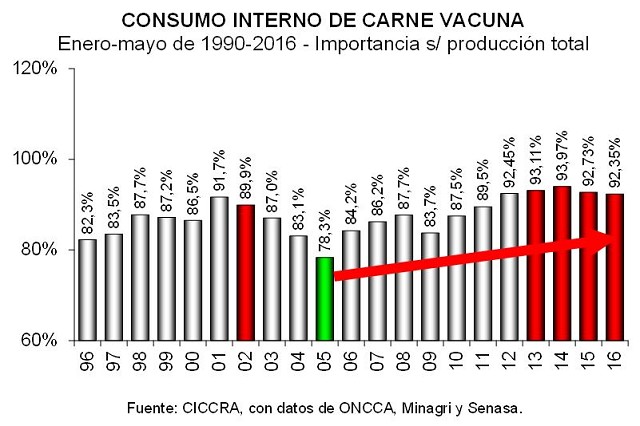 La producción de carne vacuna fue de 1,076 millones de tn r/r/h en enero-mayo de 2016, lo que significó un retroceso de 5,0% interanual. La faena disminuyó 6,1% en términos interanuales y fue compensada muy parcialmente por la corrección hacia arriba del peso promedio declarado de acuerdo a la Subsecretaría de Ganadería del Ministerio de Agroindustria (1,1% anual). De esta forma, los despachos a mercado resultaron inferiores en 56,6 mil tn r/c/h con respecto a enero-mayo del año pasado.
