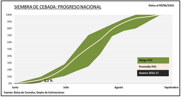 Dado este contexto, la primera proyección de área a sembrar se ubica en 1.000.000 hectáreas, cifra que refleja una contracción interanual del -16,7 % en el área cebadera (Siembra 2015/16: 1,2 MHa). Sobre la actual superficie se registra un progreso de siembra del 2,2 %, que en números absolutos representa alrededor de 23.000 Ha ya incorporadas. En la comparación interanual, esta campaña exhibe un retraso de 7,3 puntos y esto se debe a que las lluvias generaron demoras en la cosecha estival del ciclo 2015/16.