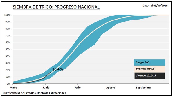 La siembra de trigo cobró mayor fluidez durante los últimos días, luego de registrar un avance intersemanal de 8,8 puntos porcentuales que permitió cubrir el 16,4 % de la superficie proyectada en 4.500.000 hectáreas para la campaña en curso. El retraso en la recolección de los lotes de soja continúa demorando las labores de implantación del cereal, razón por la cual se mantiene un retraso de - 5,7 puntos porcentuales en comparación al ciclo previo. Al presente informe, las labores de siembra se extendieron sobre todo el país al relevarse las primeras siembras en el Sudeste de Buenos Aires, elevando el área nacional implantada a 738.000 hectáreas.