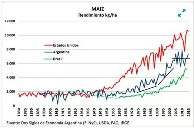 Esto no siempre fue así, sino que se registran muchos períodos de bastante igualdad en las producciones por Ha. La gran diferencia se produce a partir de mediados de la década del 40, donde se inicia el populismo en estas regiones de América Latina. Con la reintroducción de las retenciones en 2002, el volumen obtenido por hectárea se frenó mucho en los últimos 10 años.