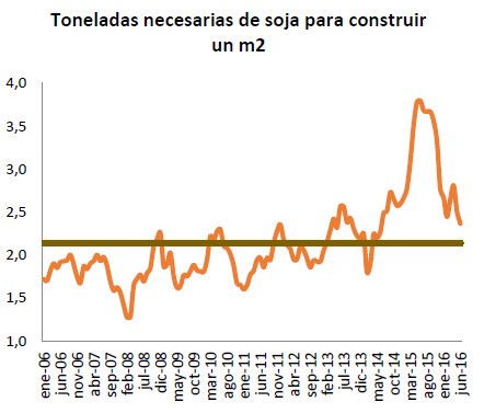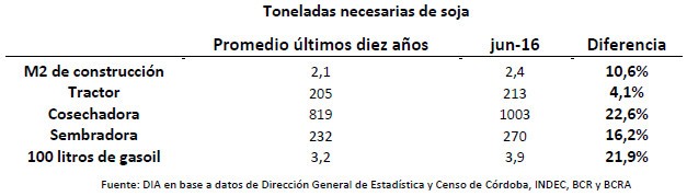 Tomando como referencia el valor de construir un metro cuadrado en la ciudad de Córdoba, la adquisición de un tractor, una cosechadora, una sembradora o 100 litros de combustible se puede constatar que es necesario destinar una mayor cantidad de toneladas del grano para poder adquirirlos.