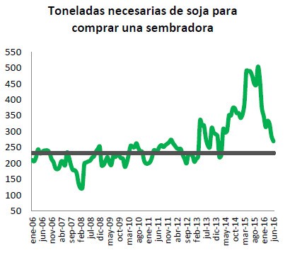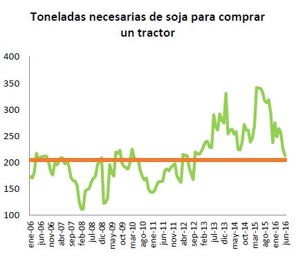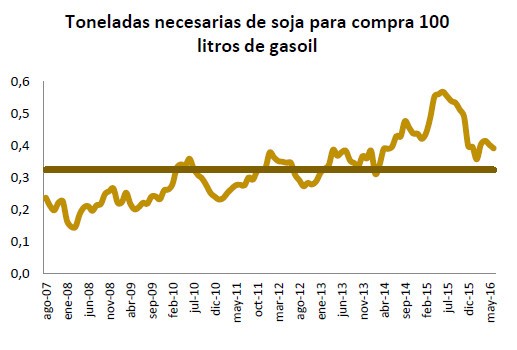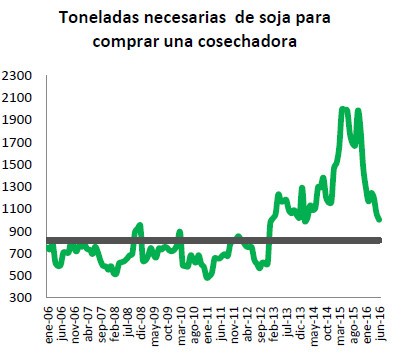 A modo de ejemplo, en junio de 2016, se requirieron 1003 toneladas de soja para comprar una cosechadora, lo cual representa un 22% por encima del promedio del período comprendido entre enero de 2006 y junio del corriente. En el caso del gasoil, se necesita un 33% respecto al promedio para comprar 100 litros.
