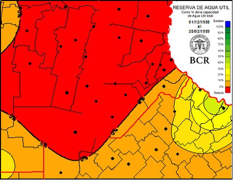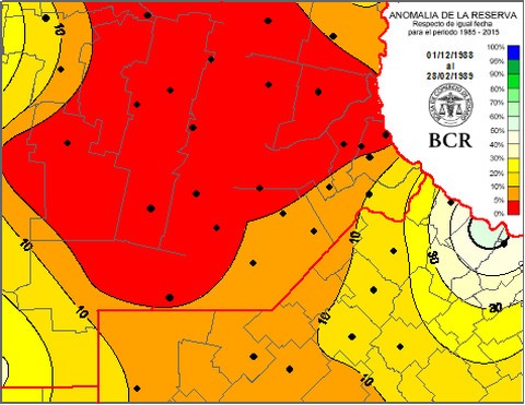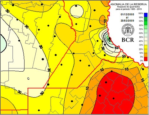 Pero para saber esto fue necesario Identificar los eventos ENSO en los últimos 30 años, y hacer la representación de la distribución de agua útil y su anomalía, en cada caso. Cuando hay herramientas, o sea una red de estaciones meteorológicas, junto al diseño de algoritmos muy pragmáticos, se puede tener un cálculo estadístico de lluvia para el período crítico de necesidades hídricas en la zona donde el productor sembrará. Un buen ejemplo de ello, es, como se muestra a continuación, los desvíos que tuvieron en esa campaña las reservas, comparándolas con las estadísticas de los últimos 30 años, para el trimestre diciembre-enero-febrero. Esto es muy importante, aparte, porqué se puede repetir el método para distintas ventanas de siembra y considerar el riesgo para cada una de ellas. Esto es hacer agricultura de precisión, teniendo en cuenta la variable que más impacta en la producción: el agua.