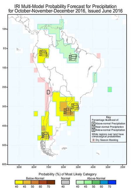 La física del ENSO es muy complicada y los modelos de predicción de su comportamiento tienen un "skill" bajo si bien en la última década se ha avanzado mucho en sus resultados, y tenemos que tener presente que LA NIÑA es la fase ENSO menos deseable para el sistema de producción agrícola en Argentina. A modo de expresar numéricamente lo anterior, la Figura 2, muestra el pronóstico de lluvias en parte del sudeste sudamericano para el trimestre octubre-noviembre-diciembre, donde se observan probabilidades altas de transitar un evento seco en las zonas más importantes de Argentina y sur de Brasil.