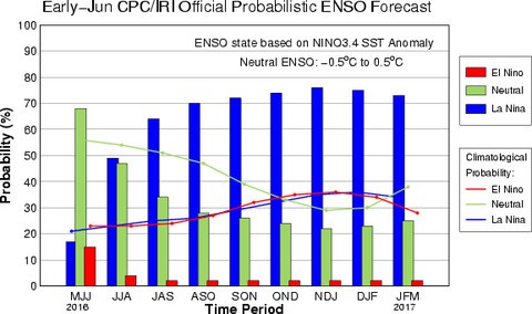 Si bien La Niña podría ser de tipo débil o moderada, la mayor "señal climática" que afecta a la producción agrícola de Argentina (y sur de Brasil) ya está marcando la tendencia de las lluvias en el período estival. Los modelos numéricos que pronostican las fases del ENSO (El Niño, oscilación del sur) están señalando la instalación de “La Niña”. La Figura 1, cuya fuente es el IRI (IRI, USA), muestra la probabilidad de aparición de las 3 fases del fenómeno y es claro ver “La Niña” tiene una alta probabilidad de ocurrencia. De hecho, para el trimestre octubre-noviembre-diciembre del corriente año el valor es del 74 %. Tomé dicho trimestre pues es el primero de los que afectarán a la cosecha gruesa nacional y "entraremos" bajo el efecto de una NIÑA, cuyo efecto físico es inhibir los flujos de humedad que el país recibe desde Brasil durante el período octubre-marzo (semestre cálido). Por ello, la intención del título de afirmar: “cosecha gruesa bajo alerta amarilla”.
