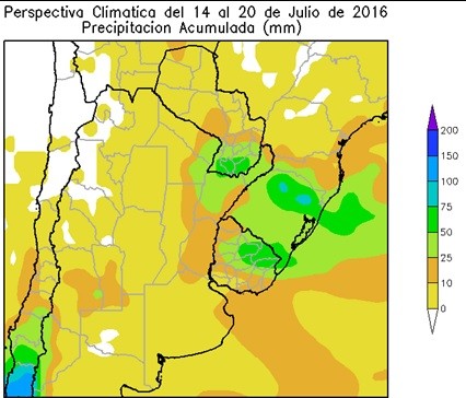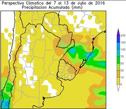 El calor y la humedad aportados por los vientos del norte provocarán precipitaciones sobre el extremo nordeste del área agrícola, mientras la mayor parte de su extensión, que no recibirá un aporte significativo de humedad, experimentará valores escasos. El sudeste del Paraguay, el este de la Región del Chaco y la mayor parte de la Mesopotamia, registrarán precipitaciones de muy variada intensidad, desde moderadas hasta muy abundantes (10 a 50 mm).