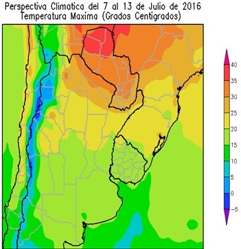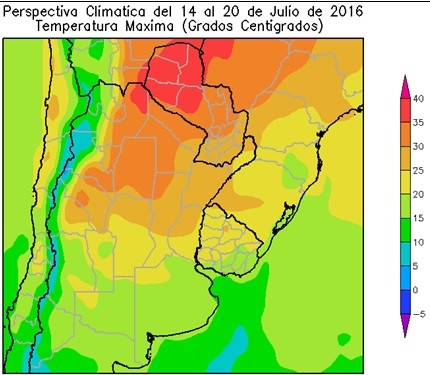 A mediados de la perspectiva, retornarán los vientos del sur, reactivando la ola de calor. El nordeste de Dakota del Norte, la mayor parte del cinturón maicero y el nordeste de la Región del Sudeste, registrarán temperaturas máximas superiores a 30ºC. La mayor parte del área triguera, el sur del cinturón maicero, la mayor parte del Delta y la mayor parte de la Región del Sudeste observarán temperaturas máximas entre 35 a 40ºC, con focos con valores superiores a 40ºC.