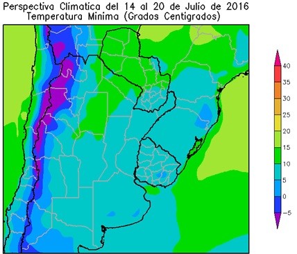 El este del NOA; el este de la Región del Chaco, la Mesopotamia, la mayor parte de Cuyo, la mayor parte de la Región Pampeana, el sudeste del Paraguay y la mayor parte del Uruguay, registrarán temperaturas mínimas entre 5 y 10°C, con focos con valores inferiores. El centro del NOA, el centro de Cuyo, el centro-este del Uruguay, observarán temperaturas mínimas entre 0 y 5°C, con riesgo de heladas localizadas.