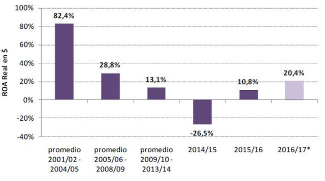 • La rentabilidad esperada para el ciclo 2016/2017 se pone en perspectiva a la rentabilidad estimada para las últimas 17 campañas agrícolas y se sensibiliza para distintos escenarios de costos, rindes y variables de la macroeconomía. Se discute también acerca de la diferencia entre rentabilidad sobre activos (ROA) y rentabilidad del capital propio (ROE) y se estiman los ROE’s que lograría cada inversión bajo distintos escenarios de apalancamiento (relación pasivo / activo) y de costo financiero de la deuda.