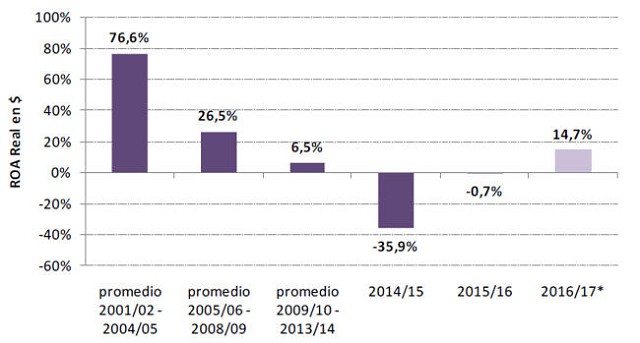 • En ambos establecimientos la rentabilidad esperada del ciclo 2016/17 mejora respecto a los últimos dos ejercicios e incluso podría llegar a situarse por encima de la observada en promedio durante el periodo 2009/10-2013/14. De todos modos, la rentabilidad proyectada quedaría por debajo de la observada durante la primera década del siglo. En el Establecimiento Zona Núcleo la rentabilidad promedió 82,4% anual (precios constantes) durante las campañas 2001/02-2004/05 (como resultado de un tipo de cambio muy competitivo) y 28,8% en las campañas 2005/06-2008/09. Por su parte, en el Establecimiento Zona Norte, estos porcentajes fueron del 76,6% y del 26,5% respectivamente en esos mismos períodos.