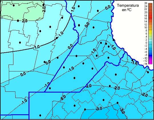 Chacabuco y Lincoln, de los más fríos de la región núcleo, con -3°C. Hacia el sur de Buenos Aires, el tiempo tormentoso recrudeció la sensación térmica y las heladas se prolongaron durante muchas horas. No fue así en la región núcleo, donde el agua en los suelos y el tiempo soleado limitaron los registros más bajos a 2 y 3 horas.