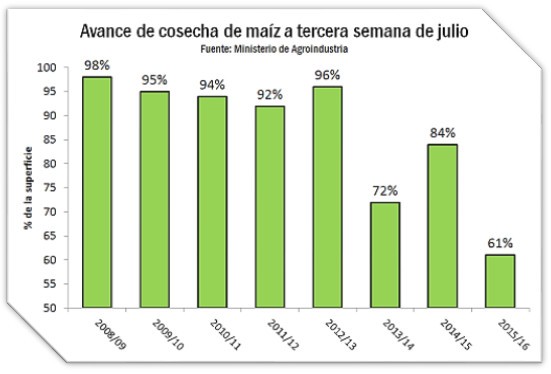 De acuerdo a los últimos datos oficiales, apenas el 61% del área ha sido trillado (al día jueves 21 de julio. Este ratio está 84% debajo del correspondiente a la misma altura del año pasado.