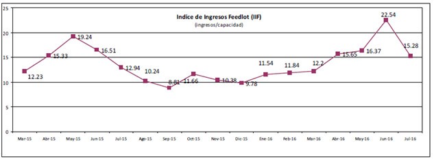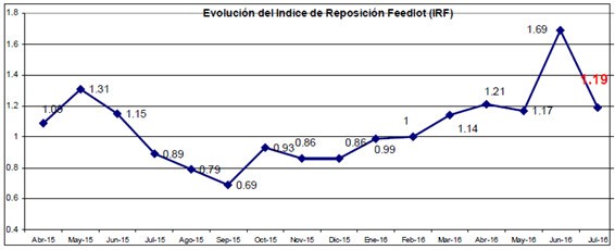 El mes de Julio nos encuentra con una ocupación de los corrales del 72 %, marcando por segundo mes consecutivo un aumento en la cantidad de animales ingresados a los sistemas intensivos y la mayor ocupación de los últimos cuatro años para el mes de julio. Ya este incremento lo marcarían los ingresos de hacienda que se realizaron durante el mes de mayo. Para nuestro informe anterior los indicadores nos mostraban una zafra de terneros retrasada por efecto de las lluvias que complicaron los caminos y retrasaron la campaña de aftosa, sorteado ese inconveniente gran parte de la invernada ingresó a los corrales en los meses de mayo y junio. Para el cierre de mayo el IRF (Índice de Reposición Feedlot) nos mostraba que por cada animal vendido gordo ingresaban a los corrales 1,7 animales de invernada y para el inicio de julio este valor regresó al nivel de 1,2, similar a los meses de marzo y abril.