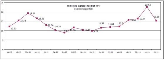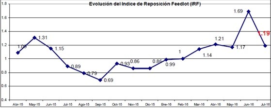 Ya este incremento lo marcarían los ingresos de hacienda que se realizaron durante el mes de mayo. Para el informe anterior de la Cámara Argentina de Feedlot (CAF) los indicadores mostraban una zafra de terneros retrasada por efecto de las lluvias que complicaron los caminos y retrasaron la campaña de aftosa, sorteado ese inconveniente gran parte de la invernada ingresó a los corrales en los meses de mayo y junio. Para el cierre de mayo el IRF (Índice de Reposición Feedlot) nos mostraba que por cada animal vendido gordo ingresaban a los corrales 1,7 animales de invernada y para el inicio de julio este valor regresó al nivel de 1,2, similar a los meses de marzo y abril.