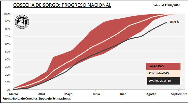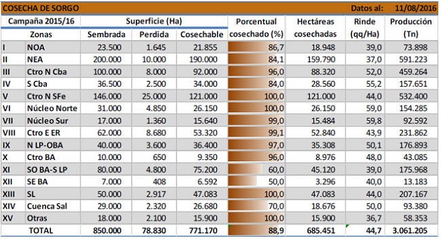 Avanza la cosecha a buen ritmo, pese a ello el retraso en comparación al ciclo previo se mantiene en torno a los 10 puntos porcentuales. A la fecha, el avance de recolección es del 88,9 % de la superficie apta, dándose por concluida la recolección en las regiones, Centro-Norte de Santa Fe, Núcleo Norte y San Luís. Los cuadros de sorgo granífero han ido perdiendo rendimiento durante los últimos meses por desgrane, vuelcos y ataques de aves, fenómenos relacionados con la demora en la cosecha. Estos rendimientos decrecientes han mantenido su tendencia negativa durante los últimos meses, generando un impacto en las proyecciones de producción de las diferentes regiones. Debido a ello nuestra proyección de producción para la campaña 2015/2016 se reduce a 3.400.000 toneladas, 100.000 toneladas menos en comparación a nuestro informe previo y reflejando una caída interanual de -2,9 % (Producción campaña 2014/15: 3,5 Mtn).