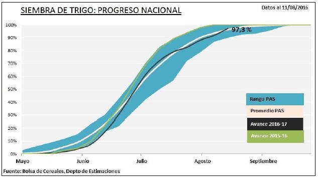 Las labores de incorporación del cereal comienzan a transitar su tramo final, gracias al avance de las sembradoras sobre los núcleos trigueros del sur bonaerense. El 96 % de la superficie que resta por implantarse a nivel nacional se concentra en las regiones Sudoeste de Buenos Aires-Sur de La Pampa y Sudeste de Buenos Aires, en donde la siembra cobró mayor fluidez durante la última semana gracias a la ausencia de precipitaciones y los días soleados. El avance intersemanal de 5,3 puntos porcentuales logró elevar el área sembrada al 97,3 % de la superficie proyectada en 4.300.000 hectáreas, cifra que de concretarse reflejaría un incremento interanual de 19,4 % (Superficie 2015/16: 3,6 MHas). El área afectivamente sembrada asciende a 4,2 MHa y a su vez se mantiene un retraso de –2,7 puntos porcentuales sobre el avance de siembra en comparación al ciclo previo. En los días previos a este informe, se dio por finalizada la siembra de trigo en las regiones Núcleo Sur, Centro-Este de Entre Ríos y Cuenca del Salado.
