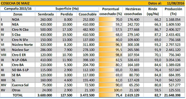 Los mayores retrasos en la cosecha se ubican en la provincia de Bs. As., a la fecha los lotes todavía poseen elevados niveles de humedad en los granos. Hacia las zonas Norte de La Pampa-Oeste de Bs. As., Centro de Bs. As. y la Cuenca del Salado, la recolección de lotes tardíos y de segunda ocupación continúan brindando muy buenos rendimientos. Sobre el Sudeste y Sudoeste de Bs. As.-Sur de La Pampa, la mejora en las condiciones del tiempo permitieron avanzar sobre los lotes de maíz. Los rendimientos llegaron a tocar picos de 120 qq/Ha, siendo común la cosecha de los cuadros con humedades un par de puntos por sobre la óptima.