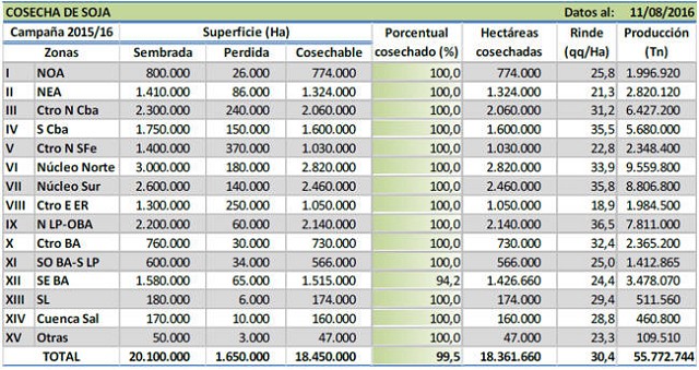 Dentro de las regiones que han concluido las tareas de cosecha, el Centro-Norte de Santa Fe es la que mayor producción aporta al acumulado nacional. Esta región sembró 146.000 hectáreas, de las cuales se perdió cerca del 16 % a causa del temporal del pasado abril. Su rendimiento, también afectado por las condiciones climáticas de fin de campaña, se ubicó en 44 qq/Ha, y la producción total fue de 530 mil toneladas. El Núcleo Norte, también finaliza su cosecha con rendimientos de 59 qq/Ha que han sido disminuidos por el clima. Con una siembra de 31 mil hectáreas y pérdidas cercanas al 15 % de la superficie, la producción de esta región ascendió a 154 mil toneladas. Finalmente, San Luís fue beneficiado por las lluvias del cierre de campaña y promedió un rendimiento de 44 qq/Ha. La producción fue de 207 mil toneladas, cuando el área sembrada fue de 50 mil hectáreas.