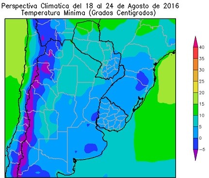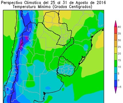 La mayor parte del Paraguay, el este de Salta, la Región del Chaco, el norte de Santa Fe, el este de Santiago del Estero y el noroeste de Corrientes, observarán temperaturas mínimas superiores a 15°C, con un foco con valores superiores. El extremo sudeste del Paraguay, el centro del NOA, la mayor parte de la Mesopotamia, el norte de Córdoba, la mayor parte de Santa Fe, el norte de La Pampa y el noroeste del Uruguay, observarán temperaturas mínimas entre 10 y 15°C. El centro-oeste del NOA, el centro de Cuyo y las serranías de Buenos Aires, registrarán temperaturas mínimas entre 0 y 5°C con riesgo de heladas localizadas.