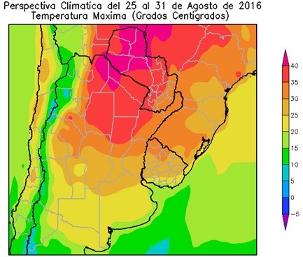 Al comienzo de la segunda etapa de la perspectiva, retornarán los vientos del norte, causando un marcado ascenso de la temperatura. La mayor parte del Paraguay, el este de Salta, la mayor parte de Santiago del Estero, la mayor parte de la Región del Chaco, el oeste de Corrientes, el nordeste de Córdoba y el norte de Santa Fe, experimentarán temperaturas máximas superiores a 35°C con focos con valores superiores a 40°C.