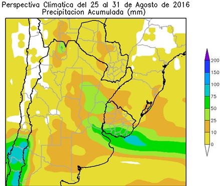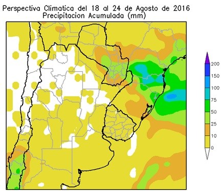 La mayor parte del área agrícola del Paraguay, el norte de la Mesopotamia, la mayor parte del NOA, la mayor parte de Cuyo, la mayor parte de Córdoba, el sudeste de Buenos Aires, el oeste de La Pampa y el nordeste del Uruguay, recibirán precipitaciones escasas (menos de 10 mm), con focos con valores moderados. El centro y el sur de la Mesopotamia, la mayor parte de la Región Pampeana y la mayor parte del Uruguay, observarán precipitaciones moderadas a muy abundantes (10 a 50 mm), y posibles focos de tormentas severas.