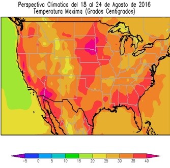 La mayor parte del área triguera, el oeste del cinturón maicero, la mayor parte del Delta y la mayor parte del la Región Sudeste observarán temperaturas máximas superiores a 35°C, con un foco con valores superiores a 40°C, sobre el sudeste de Dakota del Sur y el nordeste de Nebraska. La mayor parte de Dakota del Norte, el noroeste de Dakota del Sur, el sudeste y el oeste de Kansas, el este de Oklahoma, la mayor parte de Texas, la mayor parte del cinturón maicero, el oeste del Delta y el norte de la Región del Sudeste, observarán temperaturas máximas entre 30 y 35°C, con focos con valores inferiores.