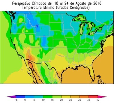 El norte y el centro del cinturón maicero, el norte de Dakota del Norte, el este y el oeste de Dakota del Sur, el nordeste y el oeste de Nebraska, registrarán temperaturas mínimas superiores a 5°C. La mayor parte del área triguera, el sur del cinturón maicero, el norte del Delta y el norte de la Región del Sudeste, registrarán temperaturas mínimas entre 10 y 15°C. El sur de Oklahoma, la mayor parte de Texas, la mayor parte del Delta y la mayor parte de la Región del Sudeste registrarán temperaturas mínimas superiores a 20ºC, con algunos focos con valores superiores.
