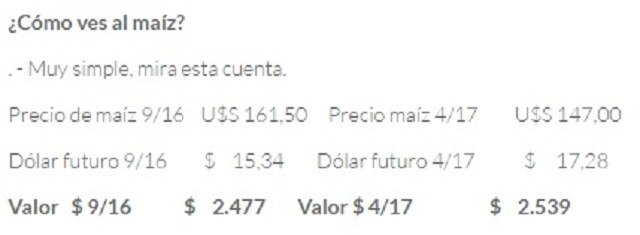 El maíz pesificado, vale lo mismo a septiembre de 2016, que a abril de 2017. Esto implica que no conviene retener. Mejor es vender, y colocar el dinero en Lebac.
