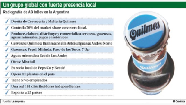 Cervecería y Maltería Quilmes controla el 76% del market share cervecero del país; produce, elabora, distribuye y comercializa cervezas, gaseosas, aguas minerales, jugos e isotónicos en alianza con PepsiCo y Nestlé. Tiene además una dotación de 5745 empleados; una red de 181 distribuidores independientes; exporta a 25 países y forma parte de Anheuser-Busch InBev, con sede en Leuven, Bélgica y que cuenta con un portfolio que supera las 300 marcas y con operaciones en más de 30 países.