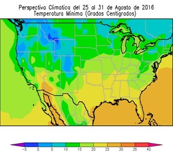 El norte y el centro del área agrícola y el norte del cinturón maicero, registrarán temperaturas mínimas superiores a 10ºC, con focos con valores inferiores. La mayor parte de Kansas, el noroeste de Oklahoma, el noroeste de Texas, la mayor parte del cinturón maicero, el norte del Delta y el norte de la Región del Sudeste, registrarán temperaturas mínimas entre 10 y 15°C. El centro de Kansas, la mayor parte de Oklahoma, el norte del Delta y el nordeste de la Región del Sudeste, observarán temperaturas mínimas entre 15 y 20ºC.
