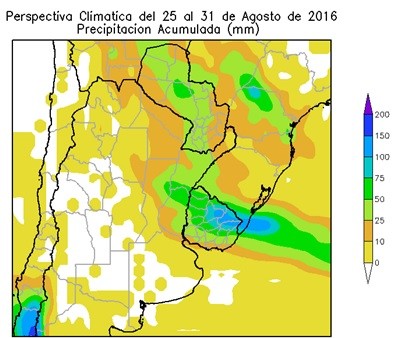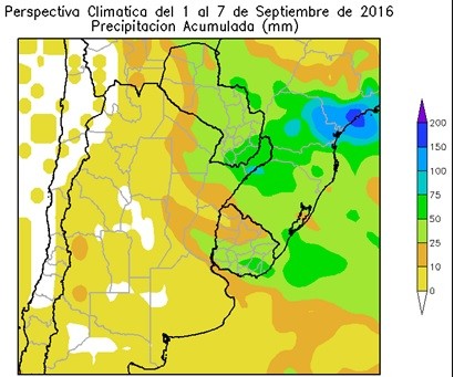 La mayor parte del área agrícola del Paraguay, la mayor parte de la Mesopotamia, la mayor parte de la Región del Chaco y la mayor parte del Uruguay, recibirán precipitaciones moderadas a abundantes (10 a 50 mm). La mayor parte del área agrícola argentina y el noroeste del Paraguay, observarán precipitaciones escasas (menos de 10 mm).