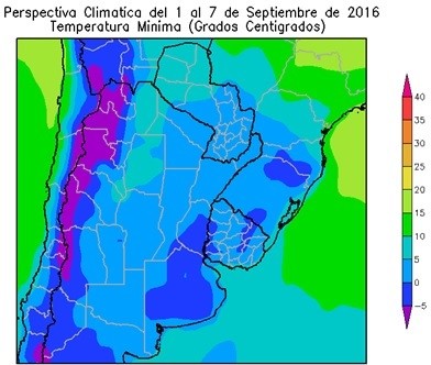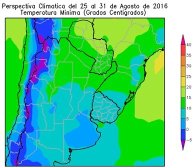 La mayor parte del Paraguay, el este del NOA, la Región del Chaco, la mayor parte de la Mesopotamia, el norte de Santa Fe y el noroeste de Córdoba, experimentarán temperaturas mínimas superiores a 10°C, con un foco con valores superiores sobre el norte del Paraguay. El centro del NOA; el este de Cuyo, el sur de Corrientes, la mayor parte de la Región Pampeana y la mayor parte del Uruguay, registrarán temperaturas mínimas entre 5 a 10°C.