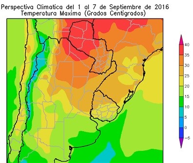Al comienzo de la segunda etapa de la perspectiva, retornarán los vientos del norte, causando un marcado ascenso de la temperatura. El nordeste del Paraguay, el este de Salta, la mayor parte de Santiago del Estero, la mayor parte de la Región del Chaco, el noroeste de Corrientes y el norte de Santa Fe, experimentarán temperaturas máximas superiores a 30°C con focos con valores superiores a 35°C.