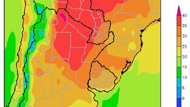 El centro del NOA, el norte de Cuyo, la mayor parte de la Mesopotamia, el norte de Córdoba, el centro de Santa Fe, el norte de Buenos Aires, el sur de Misiones, el sudeste del Paraguay y el noroeste del Uruguay experimentarán temperaturas máximas entre 30 y 35°C.