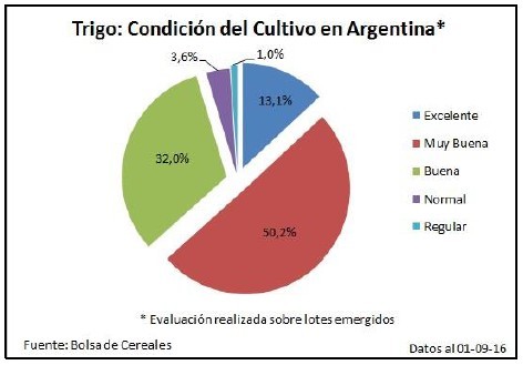 Durante la última semana las buenas condiciones climáticas que se caracterizaron por presentar precipitaciones en gran parte del territorio nacional, permitieron mejorar la condición del cultivo de trigo que comenzó a transitar etapas críticas en su ciclo fenológico. El relevamiento semanal indicó que el 50,2 % de los lotes presentan una condición de cultivo muy buena, un 13,1 % excelente, mientras que una menor proporción (1%) sufre un estado regular. Estos últimos lotes se concentran principalmente en el núcleo productivo del sector norte del NOA, región que a la fecha continúa comprometida en cuanto a la condición de humedad del perfil, ya que no registró precipitaciones en los últimos días. De todas maneras, hasta el momento no se esperan elevadas pérdidas de área a nivel nacional sobre las 4.300.000 hectáreas que se lograron implantar en la campaña 2016/17.