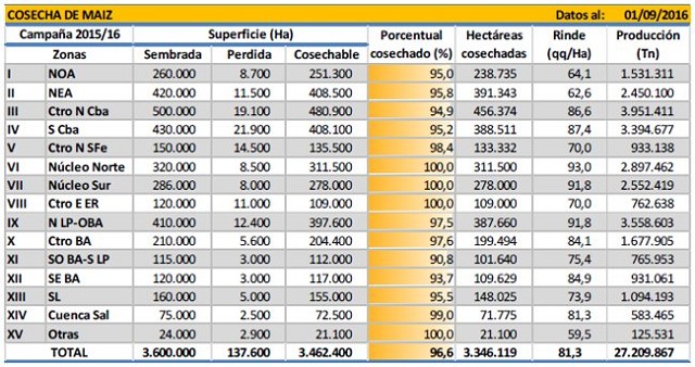 Sobre las zonas Núcleo Norte y Sur la cosecha del cereal culminó y los rendimientos se ubicaron en 93 qq/Ha y 91,8 qq/Ha respectivamente. En estas zonas se comenzaron a relevar las primeras incorporaciones de lotes tempranos, aunque se espera un aumento en la temperatura de los suelos para que se agilicen las labores. Las regiones del NEA y NOA, registraron buenos avances de trilla, particularmente en la provincia de Salta. Hacia la provincia de Córdoba, la recolección de lotes tardíos y de segunda ocupación comienza a tomar ritmo ya que los días ventosos y sin precipitaciones del último tramo de agosto, promovieron la rápida baja en la humedad de los granos.