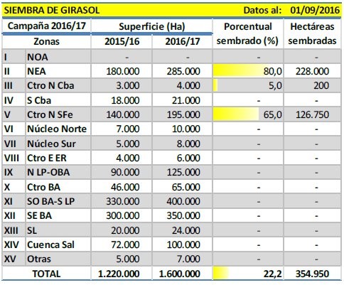 Las lluvias registradas en la última semana sobre los núcleos girasoleros del norte del país, permitieron mejorar la condición de humedad en el perfil y avanzar con la siembra del girasol. El progreso intersemanal de 4,2 puntos porcentuales logró cubrir a nivel nacional el 22,2 % de la superficie aún proyectada en 1.600.000 hectáreas, manteniendo un adelanto en comparación a la campaña 2015/16 de 5,5 puntos porcentuales. En números absolutos ya se implantaron más de 350.000 hectáreas, principalmente en el NEA y Centro-Norte de Santa Fe, donde no se descarta la posibilidad de registrar un incremento en la intención de siembra en caso de mantenerse durante las próximas semanas las condiciones climáticas que aporten la humedad óptima para la incorporación de nuevos lotes.