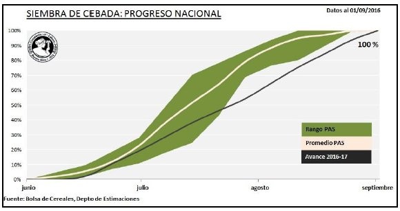 Luego de relevarse las últimas incorporaciones del cereal en las regiones Sudoeste de Buenos Aires-Sur de La Pampa y Sudeste de Buenos Aires, se da por finalizada al presente informe la siembra de cebada con destino grano comercial para la campaña 2016/17, logrando implantar una superficie de 950.000 hectáreas. La misma refleja una caída interanual del -20,8 % (Superficie 2015/16: 1.200.000 hectáreas) y se ubica un -22,6 % por debajo del promedio de las últimas cinco campañas (Promedio 2011/12 a 2015/16: 1,23 MHas). El retraso en la cosecha de soja provocó una lenta liberación de lotes para la implantación de cultivos de fina, provocando una importante demora en la implantación de cebada que disminuyó la intención de siembra en los principales núcleos productivos del cereal. Además, la campaña se caracterizó por presentar una modificación en la relación trigo/cebada, principalmente en el sudeste y sudoeste de Buenos Aires, donde el trigo recuperó parte de su superficie en detrimento del cultivo de cebada.