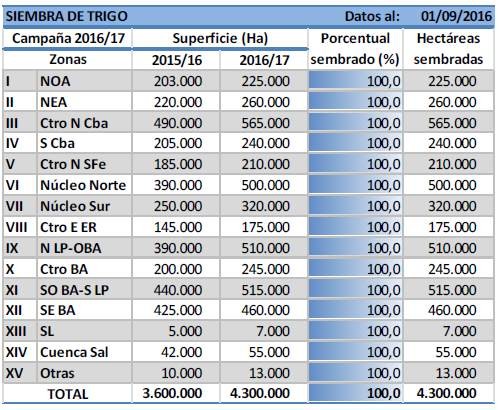 Por último, en el extremo sur de la región agrícola, sobre el Norte de La Pampa-Oeste de Buenos Aires, Sudoeste de Buenos Aires-Sur de La Pampa y Sudeste de Buenos Aires, regiones que en conjunto aportarían el 34,5 % del trigo implantado a nivel nacional, el cereal recuperó condición luego de las últimas precipitaciones registradas en los núcleos trigueros. El mismo transita etapas desde diferenciación foliar hasta macollaje, donde el crecimiento y desarrollo del ciclo fenológico se encuentra demorado como consecuencia del retraso en el inicio de las labores de siembra.