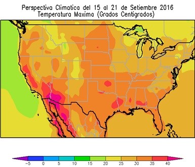 La mayor parte del área triguera, el oeste y el sudoeste del cinturón maicero, la mayor parte del Delta y la mayor parte del la Región Sudeste observarán temperaturas máximas superiores a 30°C, con varios focos con valores superiores. La mayor parte del cinturón maicero, el noroeste de Dakota del Norte, el nordeste de Kansas y el nordeste de la Región del Sudeste, observarán temperaturas máximas inferiores a 30°C.