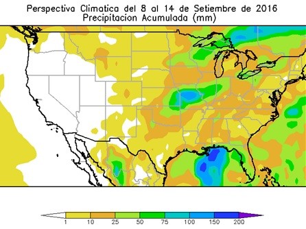 Perspectiva Agroclimática para los EE.UU. del 8 al 14 de Septiembre: Precipitaciones sobre el centro y el este del área agrícola norteamericana y el litoral atlántico y moderado descenso térmico, seguidos por calores tardíos